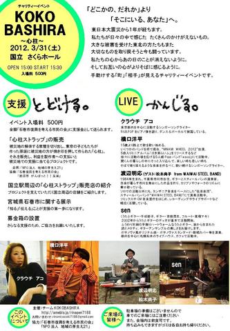 明日3/31(土)に、私の地元東京の国立という町で、「KOKOBASHIRA」というチャリティーイベントを開きます。